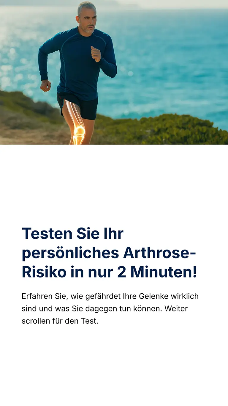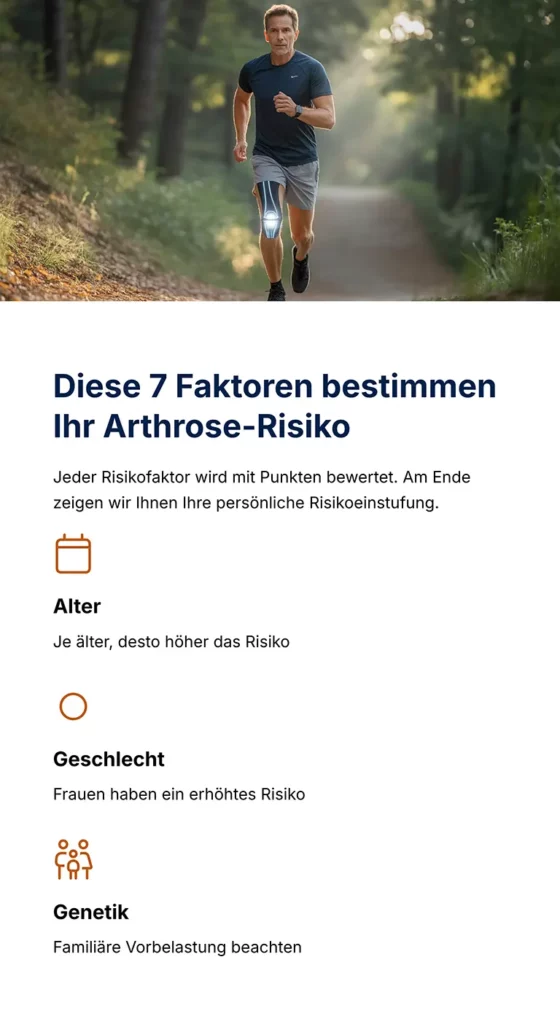 Als Experte für Arthrosetherapie biete ich Ihnen einen bildbasierten Arthrose‑Selbsttest, um Ihr persönliches Risiko in wenigen Schritten besser einzuordnen.